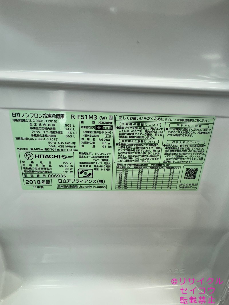【中古】日立 HITACHI 日本製冷蔵庫 505L 2018年式 R-F51M3