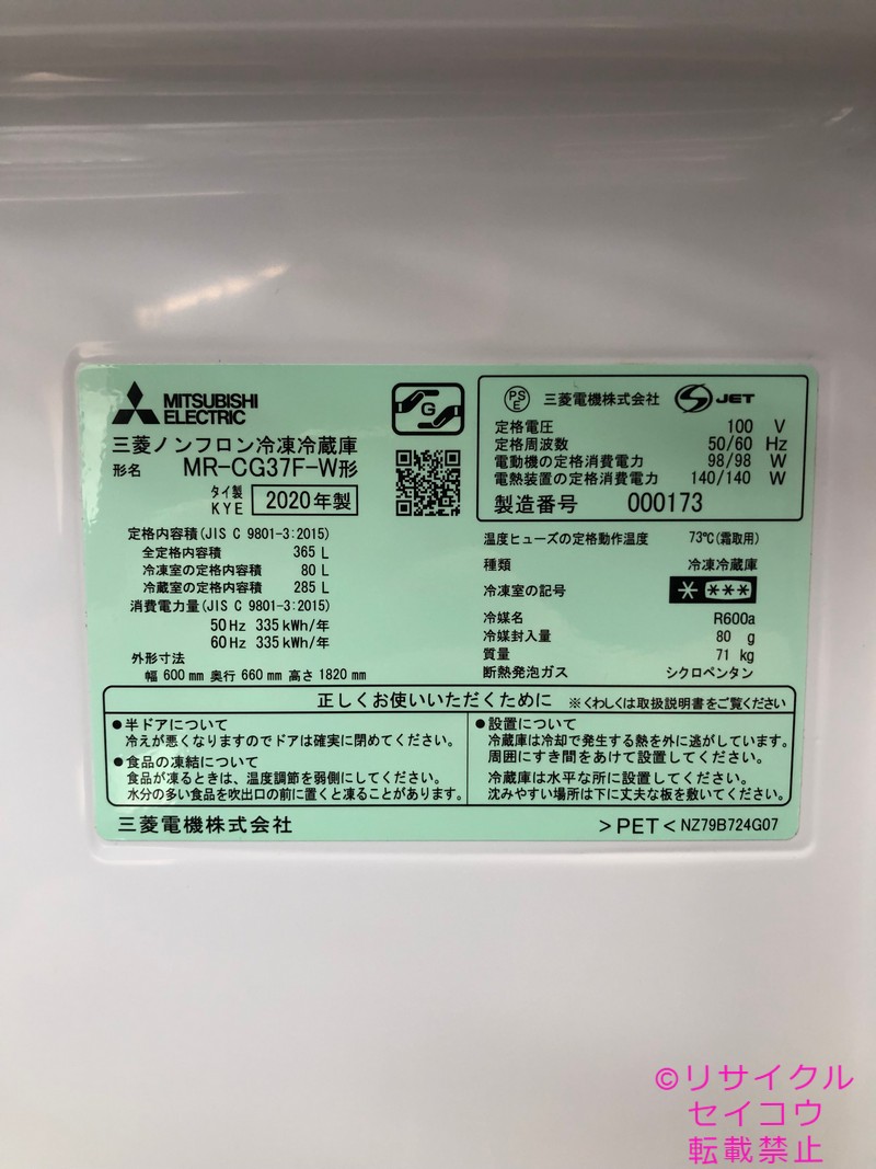 【中古】三菱 MITSUBISHI 冷蔵庫 365L 2020年式 MR-CG37F